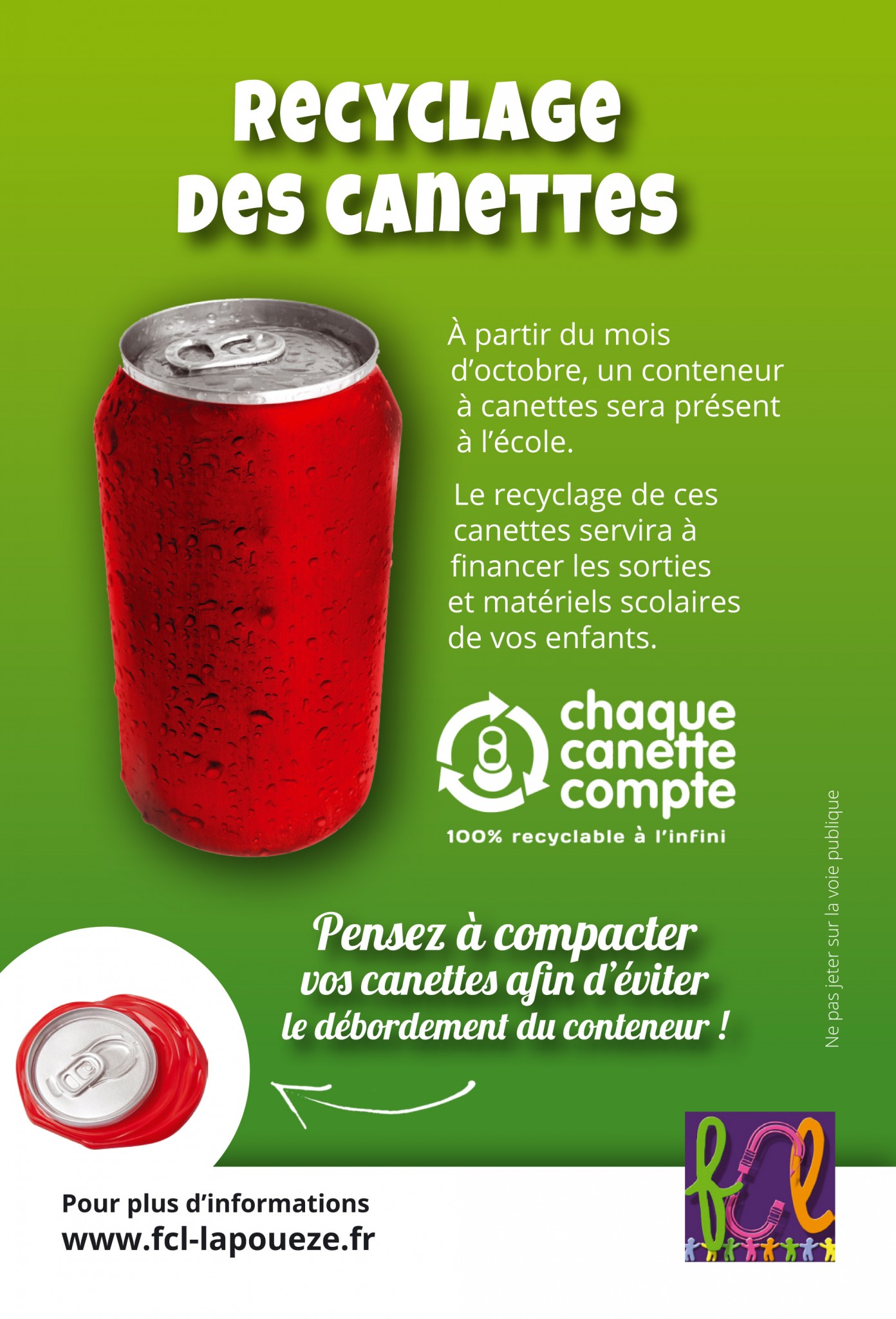 Le recyclage de ces canettes servira à financer les sorties et matériels scolaires de vos enfants.